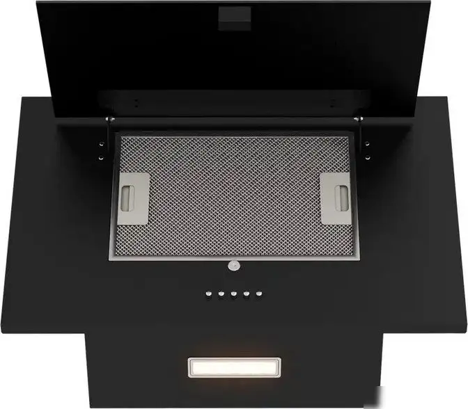 конструкция наклонная, монтаж настенный, ширина 59 см, управление механическое/кнопочное, производительность мотора 430 м×/ч, цвет черный