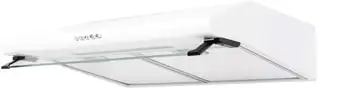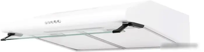 конструкция плоская, монтаж настенный, ширина 59.5 см, управление механическое/кнопочное, производительность мотора 400 м3/ч, цвет белый