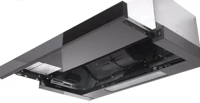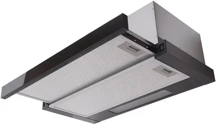 конструкция телескопическая, монтаж для встраивания, ширина 59.5 см, управление механическое/кнопочное, производительность мотора 600 м3/ч, цвет нержавеющая сталь/черный