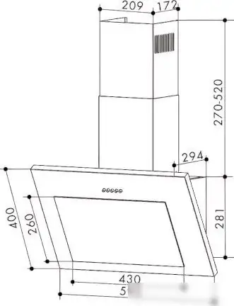конструкция наклонная, монтаж настенный, ширина 59.5 см, управление электронное/кнопочное, производительность мотора 600 м×/ч, цвет черный