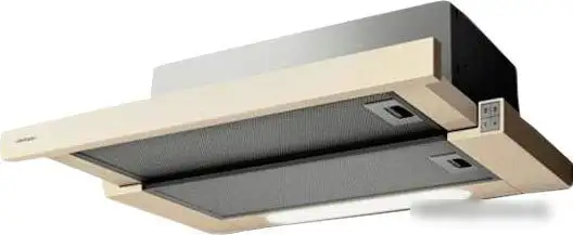 конструкция телескопическая, монтаж для встраивания, ширина 59.8 см, управление механическое/кнопочное, производительность мотора 650 м3/ч, цвет кремовый