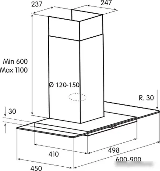 конструкция Т-образная, монтаж настенный, ширина 60 см, управление механическое/кнопочное, производительность мотора 700 м3/ч, цвет нержавеющая сталь
