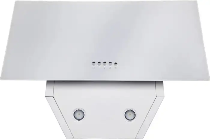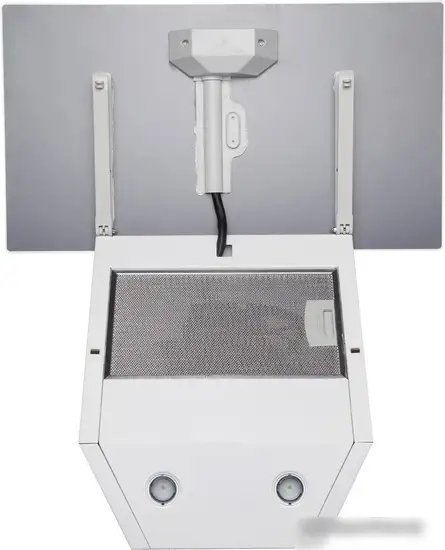 конструкция наклонная, монтаж настенный, ширина 59.5 см, управление механическое/кнопочное, производительность мотора 650 м3/ч, цвет белый