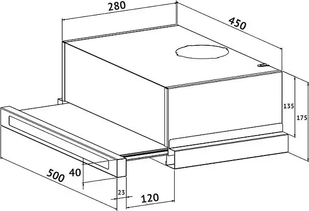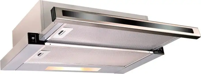 конструкция телескопическая, монтаж для встраивания, ширина 50 см, управление механическое/кнопочное, производительность мотора 600 м3/ч, цвет нержавеющая сталь/черный