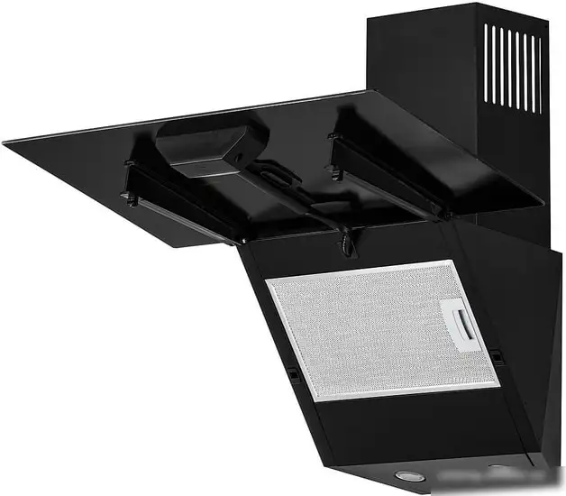 конструкция наклонная, монтаж настенный, ширина 49.6 см, управление механическое/кнопочное, производительность мотора 950 м3/ч, цвет черный