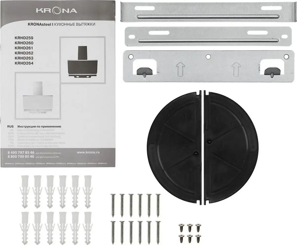 Комплектация | декоративный короб воздуховода вытяжки – 2 шт., евровилка со шнуром 120 см, переходной фланец 150/120 мм, упаковка с комплектом крепежа вытяжки к стене, инструкция |