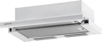 конструкция телескопическая, монтаж для встраивания, ширина 60 см, управление механическое/кнопочное, производительность мотора 507 м×/ч, цвет белый