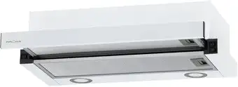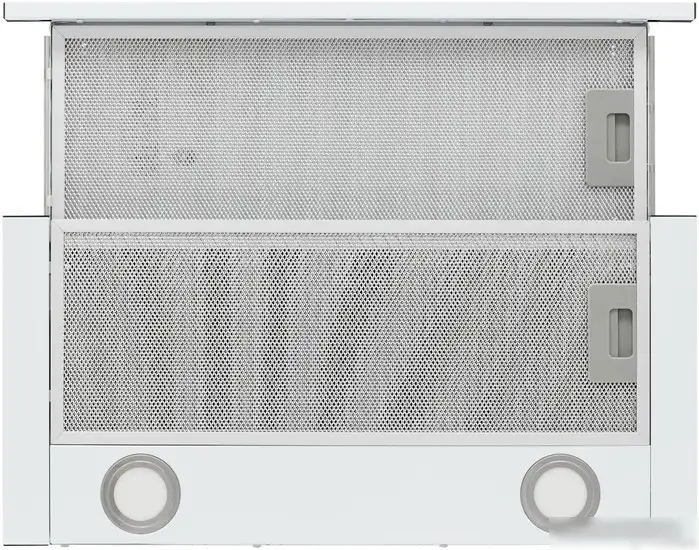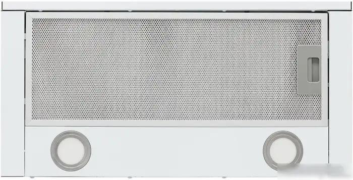 конструкция телескопическая, монтаж для встраивания, ширина 59.7 см, управление механическое/слайдерное, производительность мотора 800 м×/ч, цвет белый