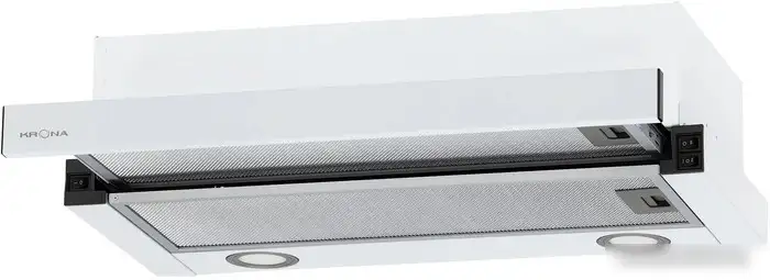 Кухонная вытяжка Krona Kamilla T 600 имеет классический дизайн и встроенную конструкцию, которая хорошо подходит для любого интерьера. Она работает на двух моторах с общей мощностью 160 Вт, обеспечивая хорошую вентиляцию с максимальной производительностью до 800 куб.м/ч. Вытяжка управляется механически с помощью слайдера и имеет три скорости. В комплекте идут два алюминиевых жироулавливающих фильтра, которые легко очищаются. Светодиодное освещение из двух ламп помогает хорошо освещать варочную поверхность. Модель работает достаточно тихо — уровень шума достигает 53 дБ. Она легко устанавливается благодаря компактным размерам и удлинённому воздуховоду диаметром 120 мм.