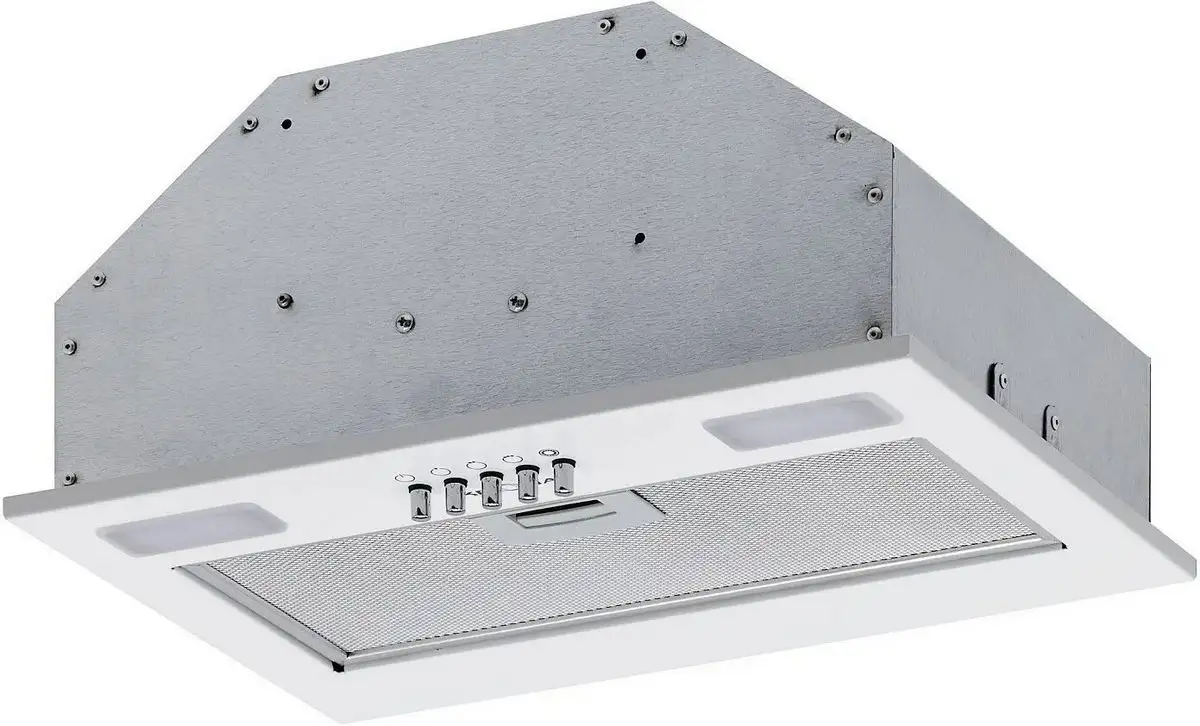 конструкция скрытая, монтаж для встраивания, ширина 40 см, управление механическое/кнопочное, производительность вытяжки 700 м×/ч, производительность мотора 850 м×/ч, цвет белый