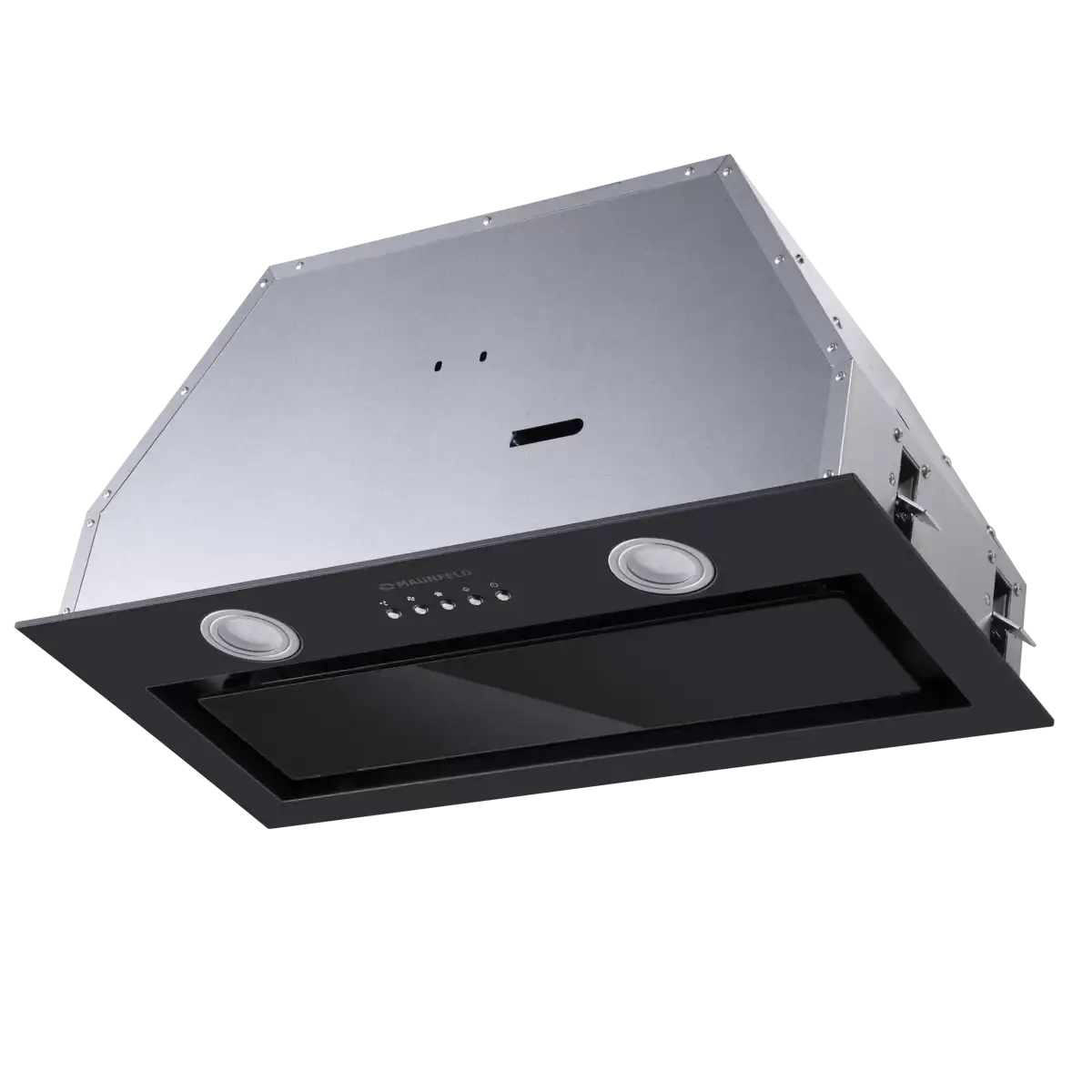конструкция скрытая, монтаж для встраивания, ширина 59.8 см, управление механическое/кнопочное, производительность мотора 1150 м3/ч, цвет черный