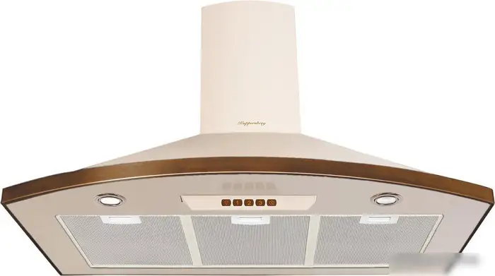 конструкция купольная, монтаж настенный, ширина 90 см, управление электронное/кнопочное, производительность мотора 650 м3/ч, цвет кремовый