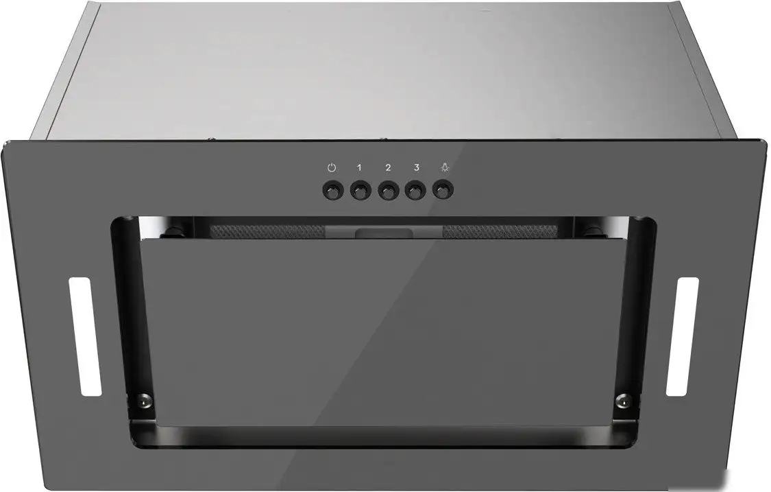 конструкция скрытая, монтаж для встраивания, ширина 52 см, управление механическое/кнопочное, производительность мотора 850 м×/ч, цвет серый