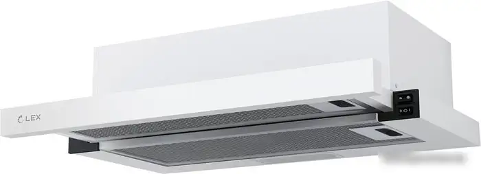 конструкция телескопическая, монтаж для встраивания, ширина 50 см, управление механическое/кнопочное, производительность мотора 650 м3/ч, цвет белый