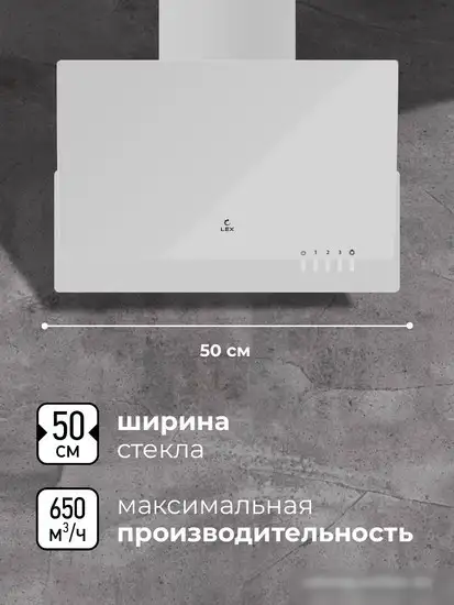 конструкция наклонная, монтаж настенный, ширина 49.5 см, управление механическое/кнопочное, производительность вытяжки 650 м×/ч, цвет белый