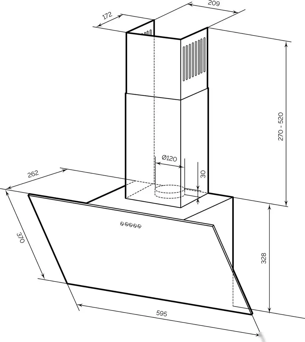 конструкция наклонная, монтаж настенный, ширина 59.5 см, управление механическое/кнопочное, производительность мотора 650 м×/ч, цвет черный