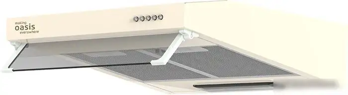 конструкция плоская, монтаж настенный, ширина 50 см, управление механическое/кнопочное, производительность мотора 400 м3/ч, цвет бежевый
