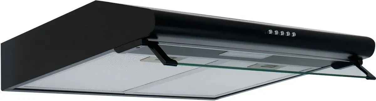 конструкция плоская, монтаж настенный, ширина 59.5 см, управление механическое/кнопочное, производительность мотора 400 м×/ч, цвет черный