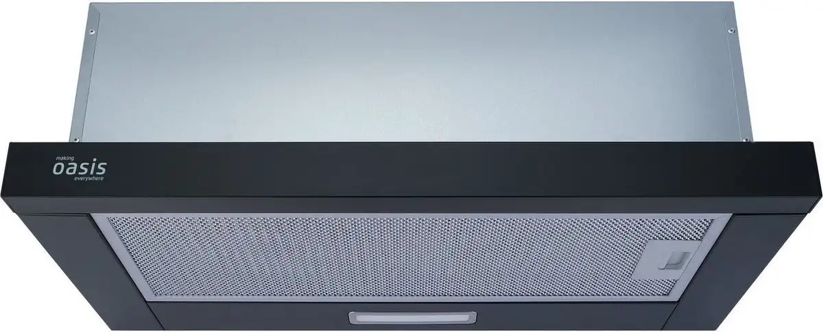 конструкция телескопическая, монтаж для встраивания, ширина 60 см, управление механическое/слайдерное, производительность мотора 500 м×/ч, цвет черный