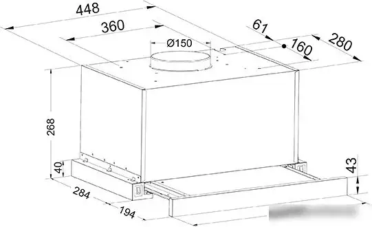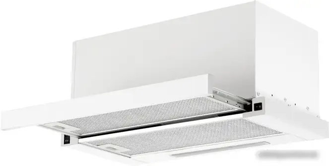 конструкция телескопическая, монтаж для встраивания, ширина 60 см, управление механическое/кнопочное, производительность мотора 1000 м3/ч, цвет белый