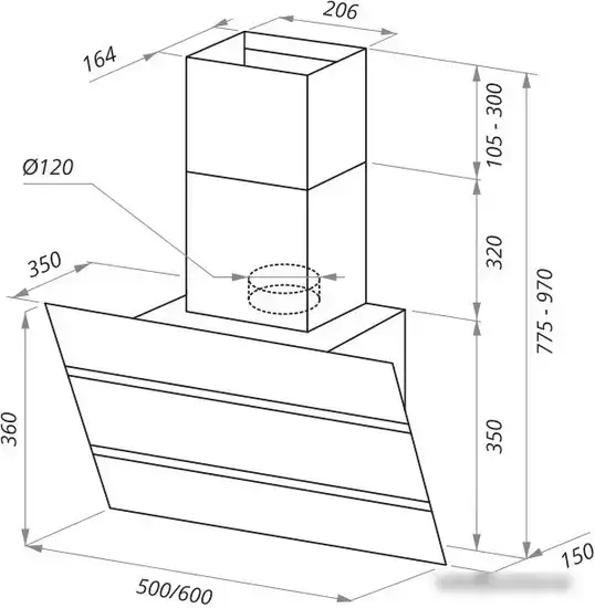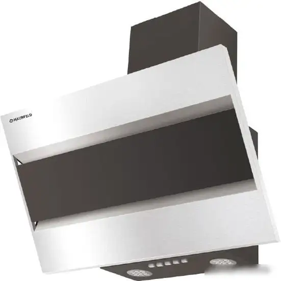 конструкция наклонная, монтаж настенный, ширина 60 см, управление механическое/кнопочное, производительность мотора 850 м³/ч, цвет нержавеющая сталь/черный