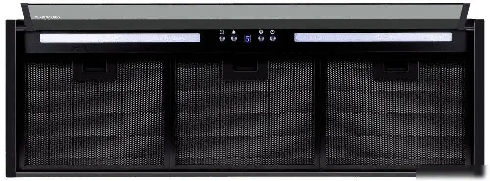 конструкция Т-образная, монтаж настенный, ширина 90 см, управление электронное, производительность мотора 1150 м×/ч, цвет черный