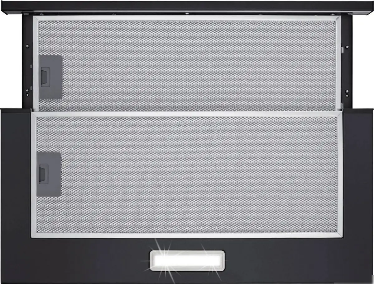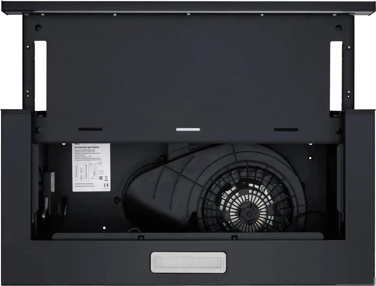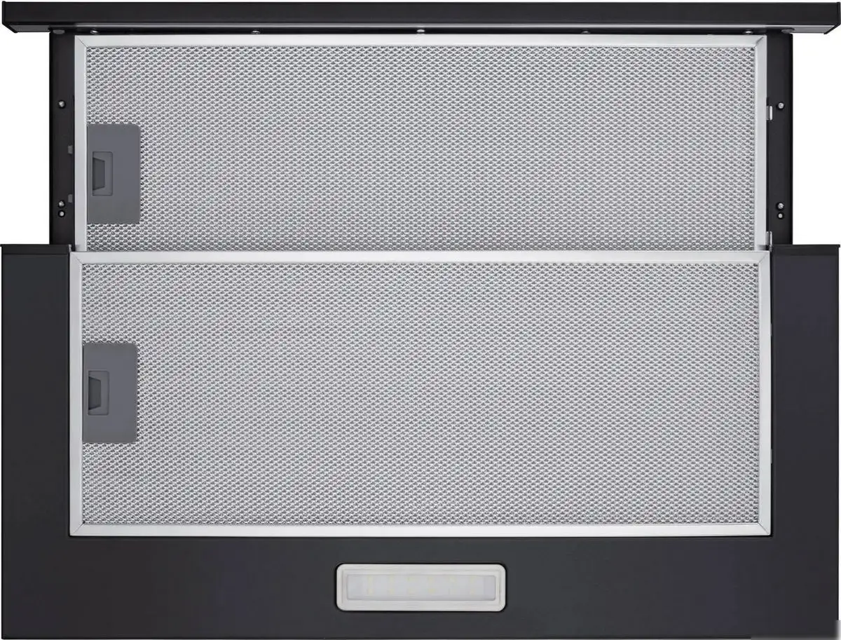 конструкция телескопическая, монтаж для встраивания, ширина 59.8 см, управление механическое/кнопочное, производительность мотора 650 м×/ч, цвет черный