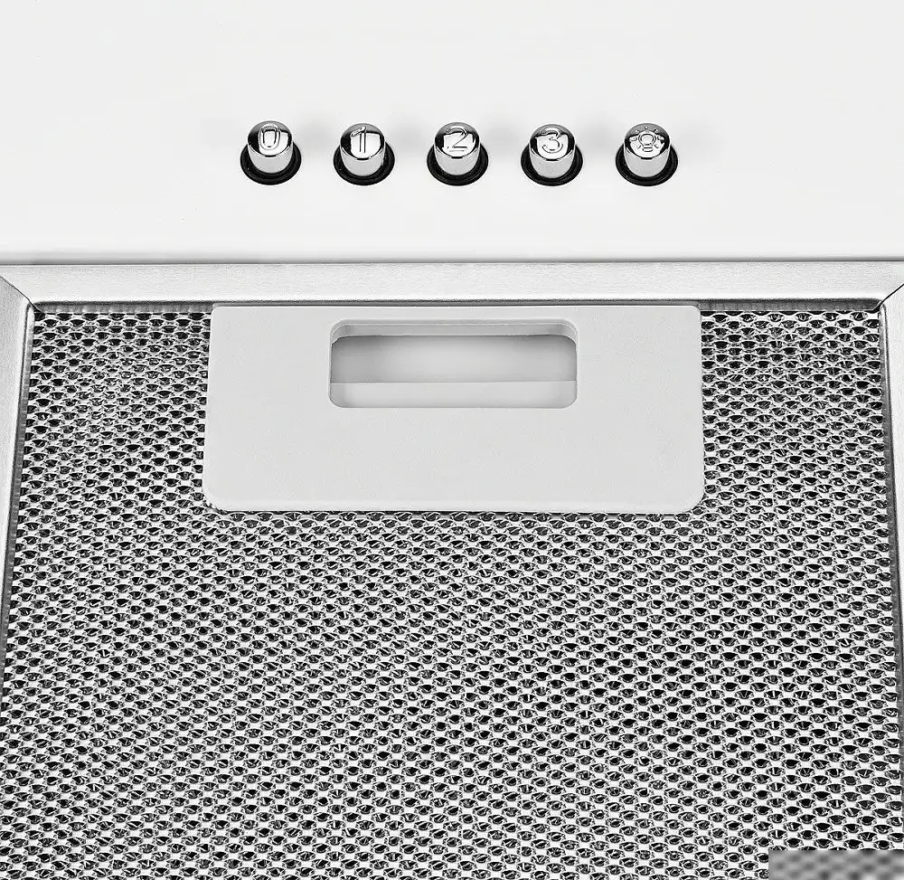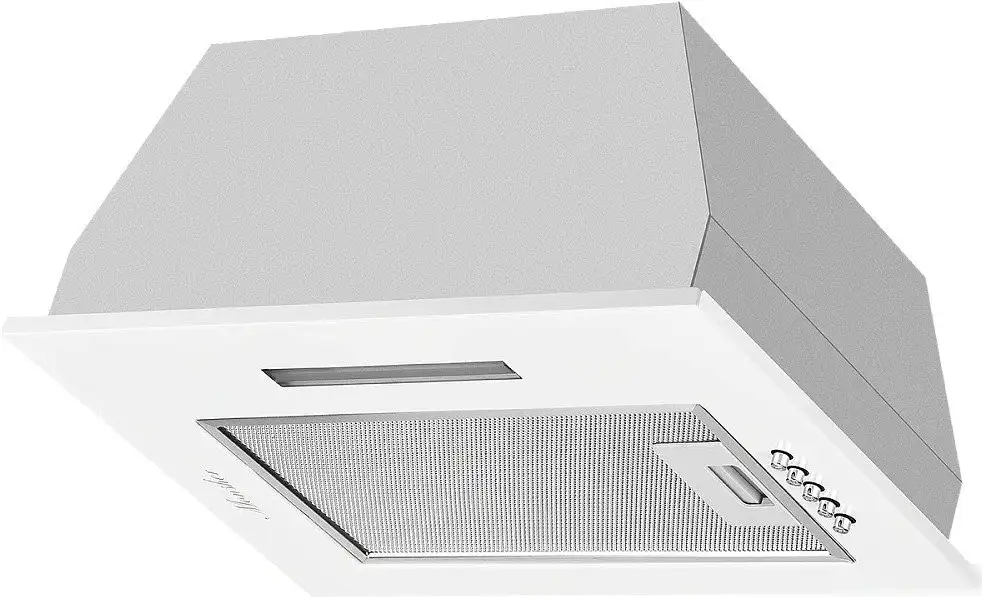 конструкция скрытая, монтаж для встраивания, ширина 40 см, управление механическое/кнопочное, производительность вытяжки 800 м×/ч, цвет белый