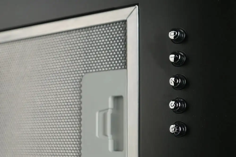 конструкция скрытая, монтаж для встраивания, ширина 54.6 см, управление механическое/кнопочное, производительность вытяжки 800 м×/ч, цвет черный