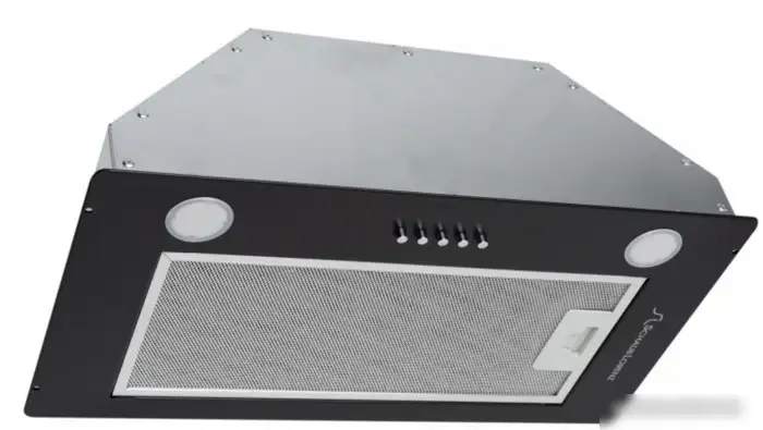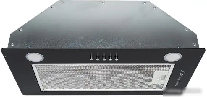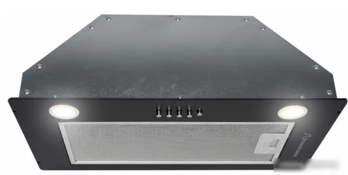 конструкция скрытая, монтаж для встраивания, ширина 52 см, управление механическое/кнопочное, производительность мотора 650 м×/ч, цвет черный