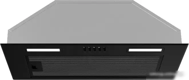 конструкция скрытая, монтаж для встраивания, ширина 59.8 см, управление механическое/кнопочное, производительность мотора 750 м×/ч, цвет черный