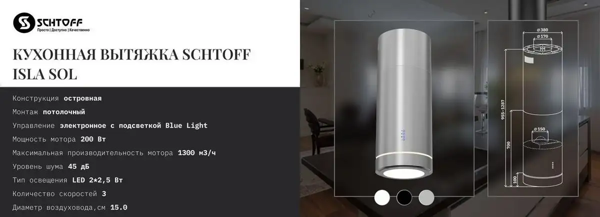 Кухонная вытяжка Schtoff Isla Sol Inox выполнена из нержавеющей стали в современном стиле. Она устанавливается как островная и управляется с помощью электронных кнопок, что делает её удобной в использовании. Вытяжка оснащена светодиодным освещением из двух ламп мощностью 5 Вт, которая хорошо освещает рабочую зону. Благодаря периметральному воздухоотводу она эффективно удаляет запахи и жир, а фильтр из алюминия удерживает загрязнения. Мощность мотора составляет 200 Вт, а максимальная производительность достигает 1300 куб. м/ч, обеспечивая быструю вентиляцию. Управление осуществляется в три скорости, а минимальный уровень шума составляет 45 дБА. Вытяжка имеет компактные размеры — ширина и глубина 38 см, а высота — 95,5 см, что делает её идеально подходящей для современных кухонь. Также она поддерживает стандартный диаметр воздуховода 150 мм для легкой установки.