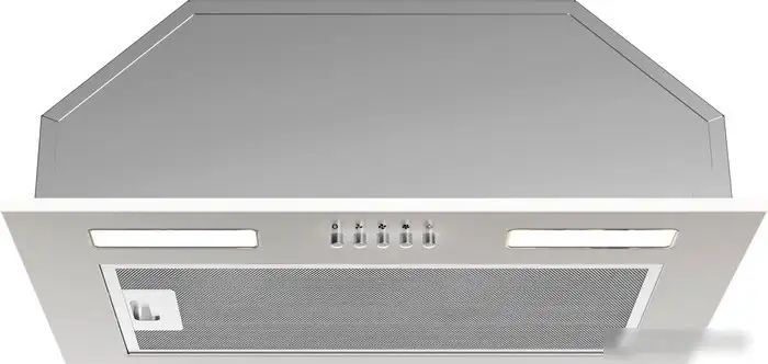 конструкция скрытая, монтаж для встраивания, ширина 59.8 см, управление механическое/кнопочное, производительность мотора 720 м×/ч, цвет белый
