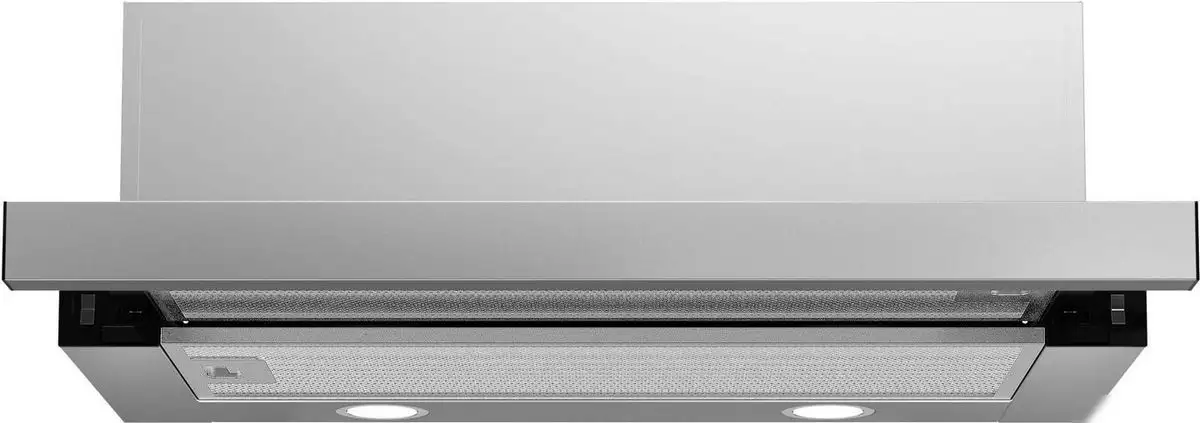 конструкция телескопическая, монтаж для встраивания, ширина 59.5 см, управление механическое/кнопочное, производительность мотора 1110 м×/ч, цвет нержавеющая сталь