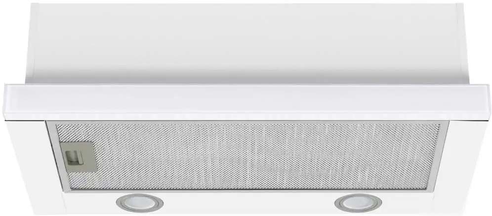 конструкция телескопическая, монтаж для встраивания, ширина 59.5 см, управление механическое/кнопочное, производительность мотора 1110 м×/ч, цвет белый