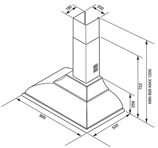конструкция купольная, монтаж настенный, ширина 89.5 см, управление поворотный переключатель, производительность вытяжки 567 м3/ч, цвет кремовый