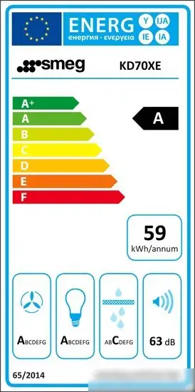 Кухонная вытяжка Smeg KD70XE выполнена в современном стиле из нержавеющей стали, подходит для установки на стену. Она оснащена поворотным переключателем для удобного управления и LED-освещением, обеспечивающим яркое и энергосберегающее освещение. Вытяжка имеет одну мощную моторную установку мощностью 275 Вт и достигает максимальной производительности отвода воздуха до 567 куб. м/ч, а в интенсивном режиме — до 788 куб. м/ч. Конструкция обеспечивает периметральное поглощение воздуха без специальной системы, жироулавливающие стальные фильтры помогают держать кухню чистой. Устройство работает с минимальным уровнем шума 50 дБ и максимальным — 63 дБ, что не мешает слушать музыку или разговаривать. Три скорости позволяют регулировать работу в зависимости от необходимости, а автоматическое отключение отсутствует. Вытяжка включает два металлических фильтра, легко снимающихся для очистки, и энергоэффективна с расходом всего 59 кВт•ч в год. Ее размеры — ширина 70 см, глубина 55,5 см, высота до 80 см (может увеличиваться до 123 см). Общий дизайн отлично впишется в современную кухню, обеспечивая эффективную вентиляцию и хорошее освещение.