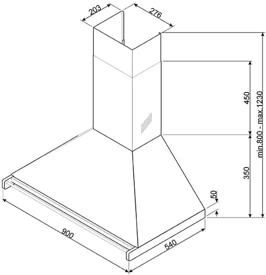 конструкция купольная, монтаж настенный, ширина 90 см, управление поворотный переключатель, производительность вытяжки 630 м3/ч, цвет нержавеющая сталь/черный