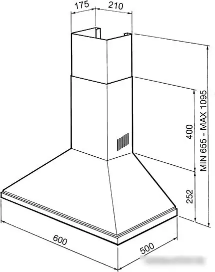 конструкция купольная, монтаж настенный, ширина 60 см, управление механическое/слайдерное, производительность вытяжки 635 м3/ч, цвет нержавеющая сталь