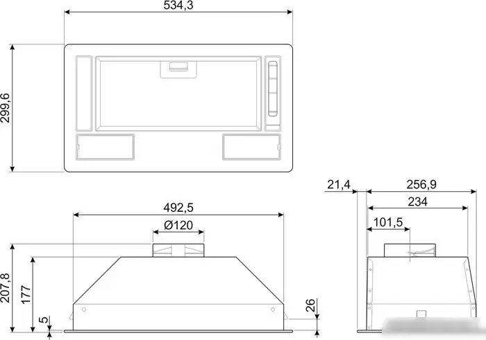 конструкция скрытая, монтаж для встраивания, ширина 53.4 см, управление слайдерное, производительность вытяжки 224 м3/ч, цвет серебристый