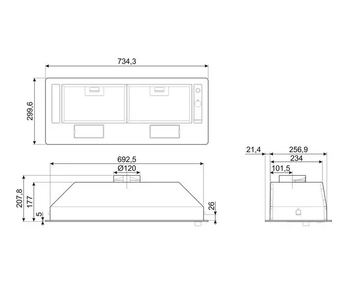 конструкция скрытая, монтаж для встраивания, ширина 73.43 см, управление механическое/слайдерное, производительность вытяжки 224 м×/ч, цвет нержавеющая сталь