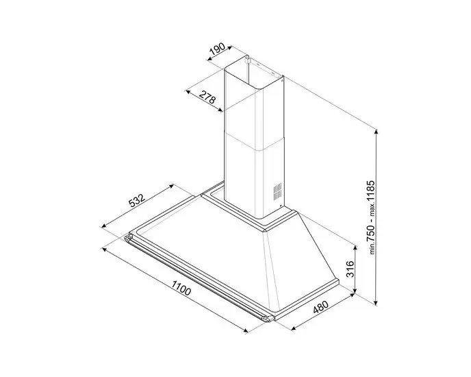 конструкция купольная, монтаж настенный, ширина 110 см, управление поворотный переключатель, производительность вытяжки 554 м×/ч, цвет серый