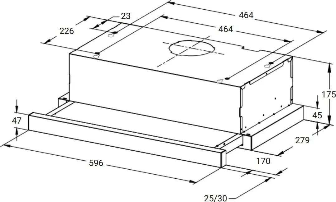 конструкция телескопическая, монтаж для встраивания, ширина 59.6 см, управление механическое/слайдерное, производительность мотора 600 м×/ч, цвет черный