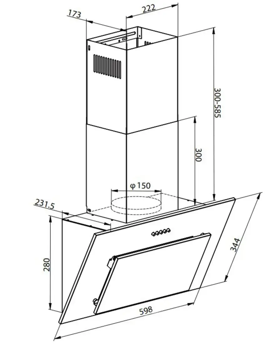 конструкция наклонная, монтаж настенный, ширина 59.8 см, управление механическое/кнопочное, производительность мотора 900 м×/ч, цвет черный