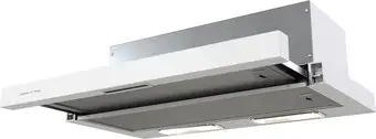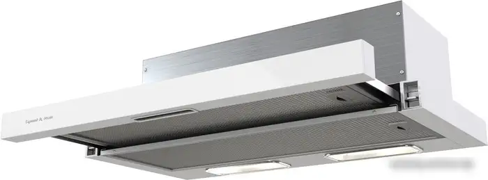 конструкция телескопическая, монтаж настенный/для встраивания, ширина 60 см, управление механическое/слайдерное, производительность мотора 550 м3/ч, цвет белый/нержавеющая сталь