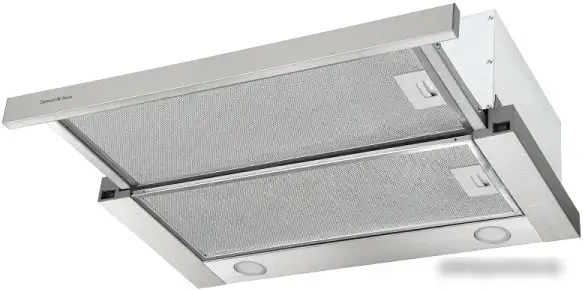 конструкция телескопическая, монтаж для встраивания, ширина 59.8 см, управление механическое/кнопочное, производительность мотора 550 м×/ч, цвет нержавеющая сталь