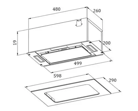конструкция скрытая, монтаж для встраивания, ширина 59.8 см, управление поворотный переключатель, производительность мотора 850 м×/ч, цвет черный