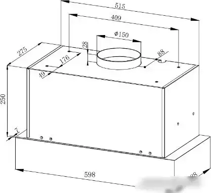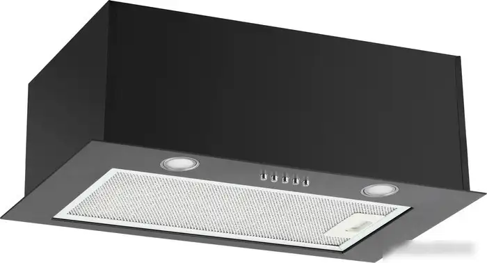 конструкция скрытая, монтаж для встраивания, ширина 59.8 см, управление механическое/кнопочное, производительность мотора 1000 м×/ч, цвет черный
