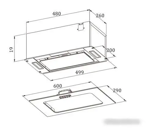 конструкция скрытая, монтаж для встраивания, ширина 60 см, управление механическое/кнопочное, производительность мотора 850 м×/ч, цвет черный