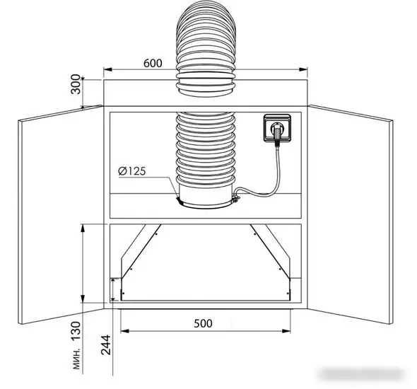 конструкция скрытая, монтаж для встраивания, ширина 52 см, управление механическое/кнопочное, производительность мотора 400 м×/ч, цвет нержавеющая сталь